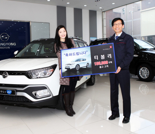 이날 쌍용자동차 발산대리점(서울 강서구)에서 열린 행사에는 10만 번째 티볼리 출고 고객과 쌍용자동차 채규병 서울강남지역본부장이 참석하여 전달식을 진행하였으며, 차량과 함께 주유권 및 티볼리 브랜드 콜렉션 기념품을 전달했다.