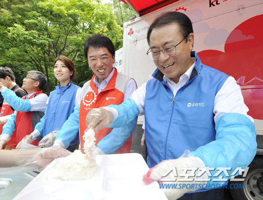 ◇ 사진은 유구현 우리카드 사장(오른쪽) , 채종진 BC카드 사장(오른쪽에서 두번째)이 배식활동을 하고 있는 모습.