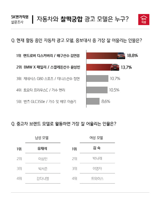 SK엔카직영 최현석 사장은 "최근 자동차 업계에서는 브랜드 전체 보다 특정 모델이나 라인업 등 홍보 대상을 세분화해 각 이미지에 걸맞은 다양한 분야의 광고 모델을 선정하는 것으로 보여진다"며 "이번 설문을 통해 메인 타겟이 명확한 신차 시장에 비해 중고차는 전 세대에게 두루 호감을 얻을 수 있는 친근한 이미지의 모델들을 선호하는 소비자 인식을 엿볼 수 있었다"고 말했다.