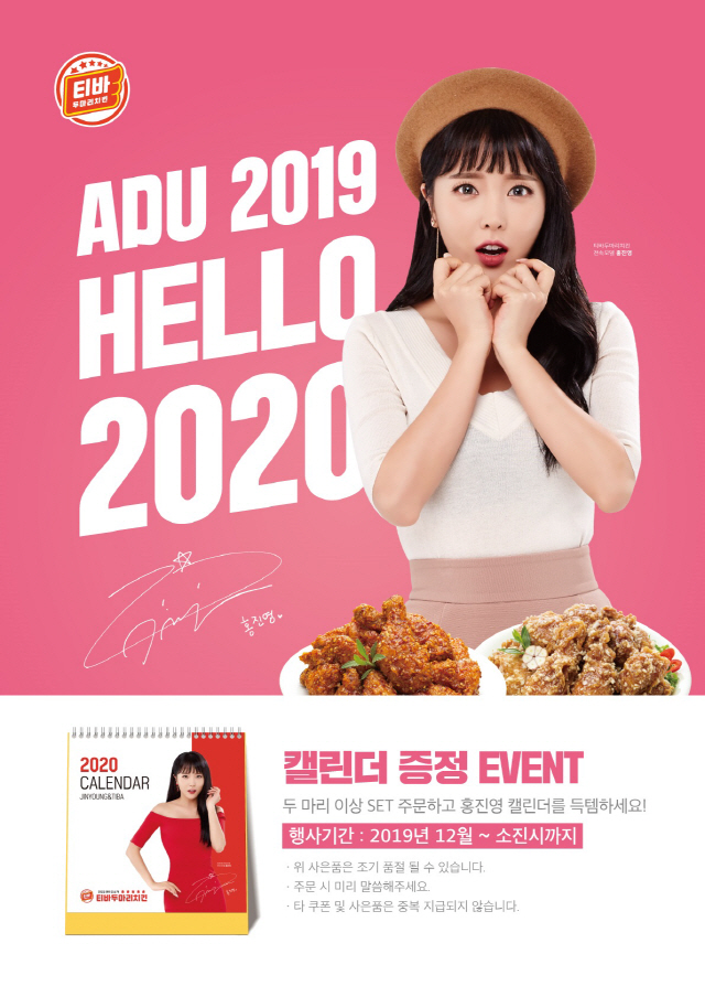 2020년 티바두마리치킨 캘린더 무료 증정 이벤트는 전국 가맹점에서 진행된다(캘린더 행사 참여 가맹점에 한해 증정). 티바두마리치킨의 2020년형 캘린더는 지난해와 동일하게 사용하기 편리한 탁삭용으로 제작됐고, 전속모델 홍진영의 특유의 애교 넘치는 다양한 모습이 담긴 화보와 치킨 용어를 월별로 구성해 보는 재미를 더했다.