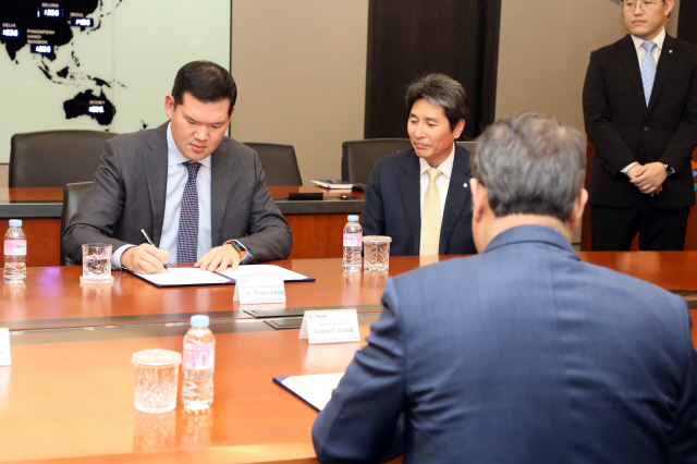 GS건설은 11일 인도 리뉴 파워와 'ISTS-IV 300MW 태양광발전사업' 주주간협약 서명식을 진행했다. 사진은 주주간협약 서명식에서 사인을 하고 있는 허윤홍 GS건설 신사업본부 대표(사장) 모습.
