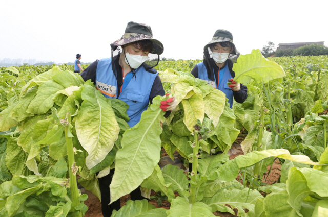 KT&G가 지난 13일 일손 부족으로 어려움을 겪는 잎담배 농가를 돕기 위해 충남 아산시 일대에서 수확 봉사활동을 진행했다고 17일 밝혔다.