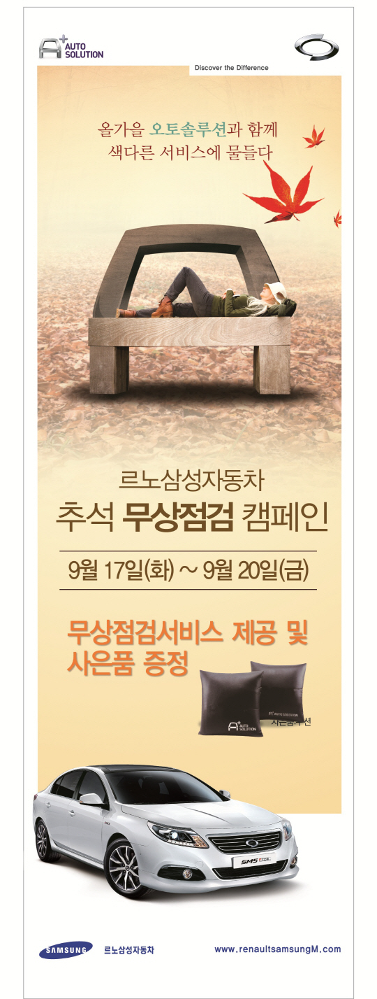 르노삼성자동차(대표이사 프랑수아 프로보)가 2013년 추석연휴 특별 무상점검 서비스 및 한가위 맞이 A/S 프로모션을 실시한다. 17일부터 20일까지 4일간 진행되는 이번 특별 무상점검 서비스는 귀성 및 귀경으로 인해 유동인구가 많은 전국 주요 고속도로 휴게소 8곳에서 진행된다.