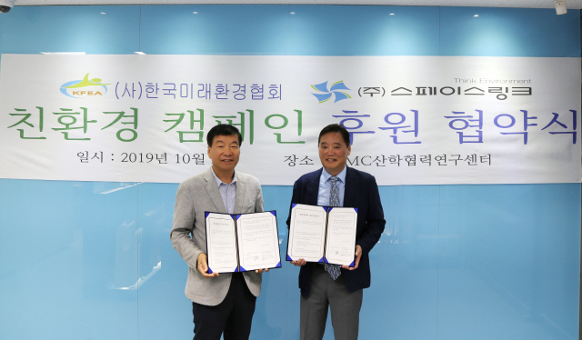 한국미래환경협회 (회장 유찬선)와 친환경 기업인 스페이스링크(대표 양희식)가 지난 2일 스페이스링크 본사 회의실에서 일회용 우산비닐 줄이기 친환경 캠페인을 진행하기 위해 업무협약을 체결하는 모습.