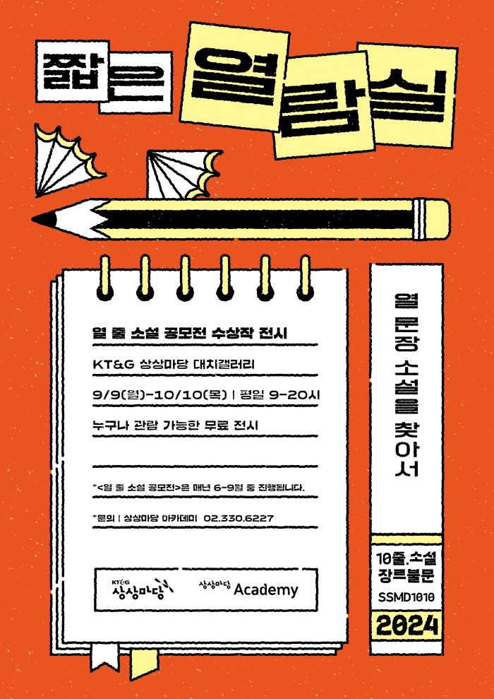 KT&G 상상마당이 '열 줄 소설 공모전'의 본선 진출작과 대상 수상작을 한자리에 모은 전시회 '짧은 열람실'을 10월 10일까지 KT&G 상상마당 대치갤러리에서 개최한다. '열 줄 소설 공모전'은 문학 저변 확대를 위해 진행되는 공모전이다. 특히 신인 작가들에게는 데뷔의 발판이 되어주고 있다. 지난 4년간 1만 명 이상이 응모하고 1만 2000여 편의 작품이 투고되는 등 뜨거운 호응을 얻었다.